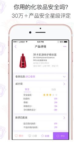 通过化妆品全成分表和安全星级算法解读化妆品、护肤品的安全和功效成分。为孕妇护肤、敏感型肤质、妈妈给宝宝和家人挑选护肤品提供参考。