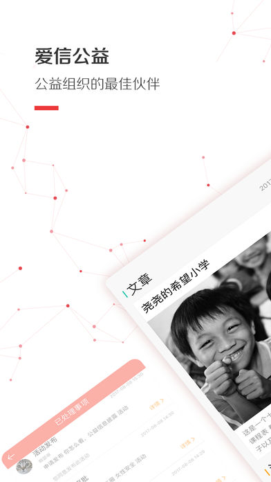 报名参加公益组织很久了,但从没有通知过我参加活动? 我们机构有很多人加入,但开展活动时总感到不知通知谁来参加? 我们辖区公益活动不少,但不知道有多少公益组织?有那些人参加? 孩子出了意外花光了全部积蓄,但任然无力解决,不知道有谁能帮帮我? 企业发展了想回报社会,但不知道怎样才能实现企业与公益的有效对接?爱信公益一款专属为公益组织和爱心人士打造的移动APP,致力于一站式解决公益组织发展面临的所有问题。 “华夏爱信”公益APP用全新的视角,独到的眼光,以公益为切入点,按照公益性、实用性的设计理念,将公益APP打造成一个全国性的公益圈,并最终现实“人人可公益,人人都受益”的社会公益大格局。