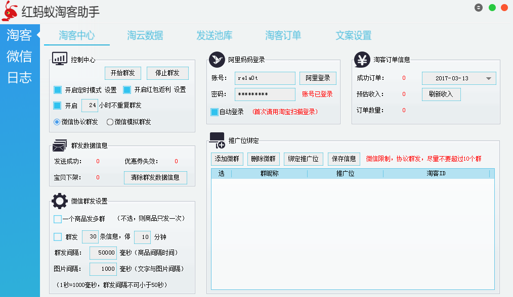 红蚂蚁淘客助手是一款免费的微信淘客助手软件,红蚂蚁微信淘客助手支持微信商品群发功能,具备定时群发,后续将开发模拟群发,由于微信限制,协议群发的频率相对较低。欢迎下载体验!
