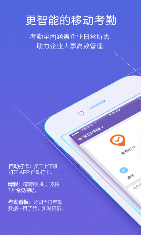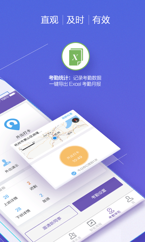 考勤看板一目了然;外出打卡记录到达、离开时间地点。