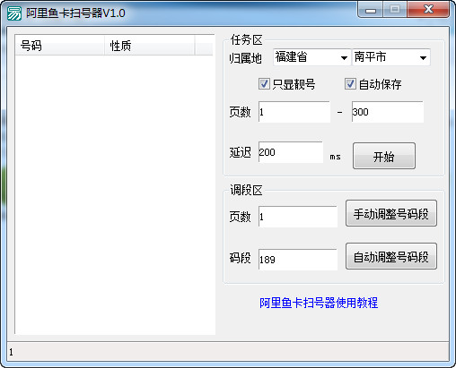 阿里鱼卡扫号器这是一个专为阿里鱼卡制作的阿里鱼卡靓号筛选工具,用户可以使用本软件来进行阿里鱼卡号码的挑选,申请各种靓号,有需要的朋友欢迎下载使用。【使用方法】