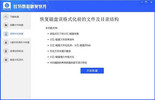 比特数据恢复软件是由江下信息科技(惠州)有限公司开发并独家发行的一款全能的数据恢复软件,可以有效解决各种硬件、软件或人为误操作引起的文件、数据丢失问题!比如:误删除文件、误格式化分区、误分区、文件不能复制、分区打不开、提示RAW等。支持硬盘、U盘、内存卡等多种设备;支持FAT16、FAT32、NTFS、exFat等多种文件系统;完美兼容全线Windows系统;操作简单,扫描速度极快,恢复效果极好!边扫描边显示,随时可以恢复找到的数据,不用等扫描完成。【功能介绍】