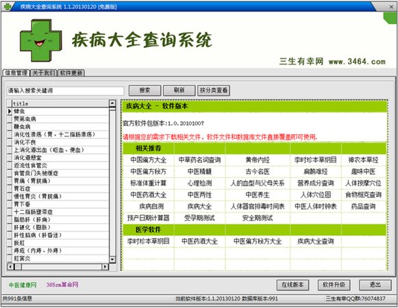 疾病大全查询系统可以查询各种疾病的知识、症状和临床表现,以及各种疾病的预防方法和注意事项等。 软件性质:完全免费,并长期提供免费数据库升级。