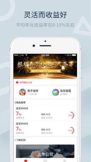 【产品丰富,选择多】巨和宝率先推出灵活而收益好的理财产品,有多种标的理财产品可供选择,为用户提供透明、便捷、安全的掌上金融理财平台。【投资灵活,收益好】能全程网上操作,三步完成投资,自动获取收益,最低100元就能起投,平均年化收益率在8-15%左右。