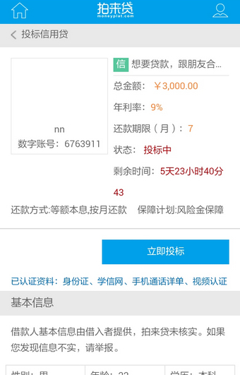 预期年收益近10%,基本上当日满标起息,提供风险准备金保障(详见拍来贷风险准备金协议)。