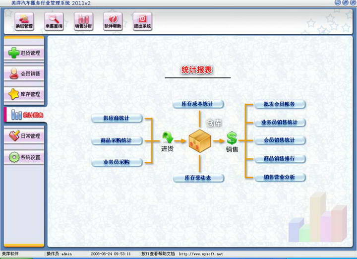 美萍汽车服务行业管理系统是一款专业的汽车美容、汽车维修、汽车配件销售为一体的管理软件,其中包含功能强大的进销存管理系统 ,客户(会员)管理,客户帐务管理,员工提成管理系统等子模块,是专门为汽车服务行业定制的管理软件。美萍汽车服务行业管理软件界面简洁优美,操作直观简单,人性化的设计,无需专门培训,贴近管理人员工作流程,使工作人员能很快的掌握软件的操作流程,大大提高了管理人员工作质量和工作效率,是汽车服务行业进行信息化管理的强大工具。【功能介绍】