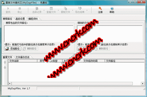 重复文件查找王 V1.8 简体中文绿色免费版 以最快的速度找出指定目录中内容重复的文件列表,便于您据此清理文件,减少重复文件对磁盘空间的占用。