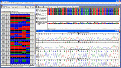 Sequencher 能够给你足够的信心认为一个序列是绝对正确的。你可以只观察一个序列的色谱图,你也可以从前端或反方向同时查看多个对齐的色谱图。 在你的已对齐数据中滚动是很容易的。你可以使用 Sequencher 的选择工具来高亮不一致或者低质量的区域。