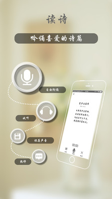 -界面简洁,操作方便。从写诗到上传只需要三步。-海量素材库可供选择。用户可以从数据库选择自己喜欢的背景图片、背景音乐为诗歌增光加彩。