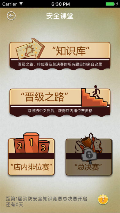 安全课堂:通过在线答题的方式,帮助用户学习消防知识,同时用户可以参加消防部门组织的消防知识竞赛;隐患快拍:对身边的消防隐患随手拍照,并提供给消防管理部门;