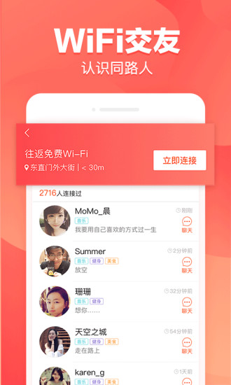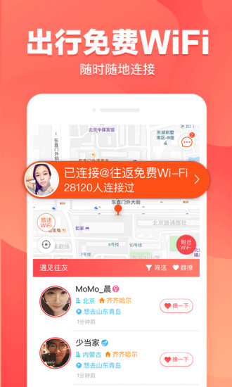往返,8000万个免费Wi-Fi,随时随地想连就连;火车大巴全程覆盖,出行必备联网神器;Wi-Fi交友,想撩就撩,还能发送纸飞机;诚意满满的福利优惠,轻松快乐赢大奖!【软件特色】