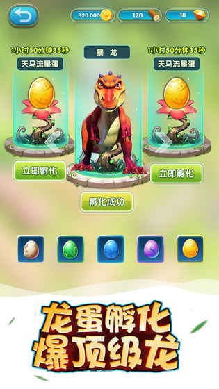 玩家可以通过日常任务及掠夺获得不同品质的龙蛋,孵化龙蛋后可以随机获得一头恐龙,大部分龙蛋都有几率孵化出顶级恐龙。游戏根据真实权威史前资料制作上百种稀有恐龙,每一头恐龙都各具特色,如何策略搭配才是取胜的关键。