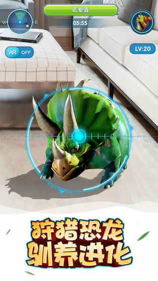 ---捕捉恐龙驯养进化---玩家可以通过探索在地图上发现恐龙出没后,即可进行AR抓捕,通过运用手机摄像头来对恐龙进行互动或者攻击,成功捕捉后便可开始驯养恐龙。
