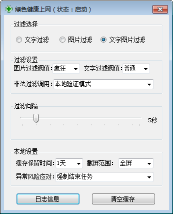 绿色上网助手是一款专为小朋友们所提供的绿色上网辅助软件。开启绿色健康上网状态后,选择要过滤的内容,设置好过滤间隔,即可有效的过滤不符合小朋友观看的内容,为他们打造绿色健康的上网环境。