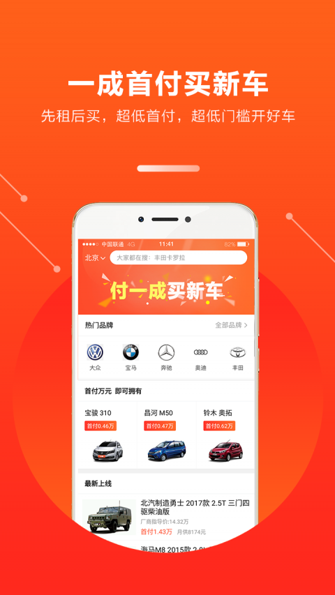 优信新车“一成购”是优信推出的一款面向广大消费者的用车方案,仅需支付车价的10%,就可以把车开回家,客户无需承担购置税、保险、上牌等费用,租赁首年,只需按月支付租金,首年期满后,客户可以灵活选择还清尾款还是继续续租。极大的降低了购车门槛。车源多多,选择多多,一成首付购新车,年轻人的新选择。