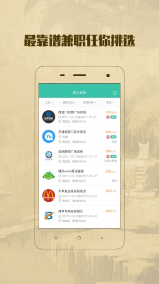 【真实职位】兼职信息全部由签约企业提供、职位真实有效;【签到打卡】实时打卡定位,随时向企业反馈上岗信息,让工作履历进行持续记录;