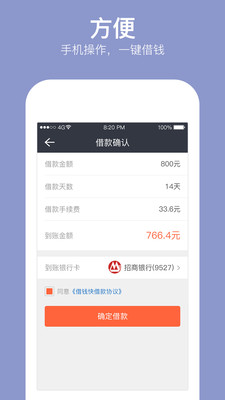 1.审核神速,现在申请,马上就能借到钱!2.操作简单,手机上填资料,获得借款额度。