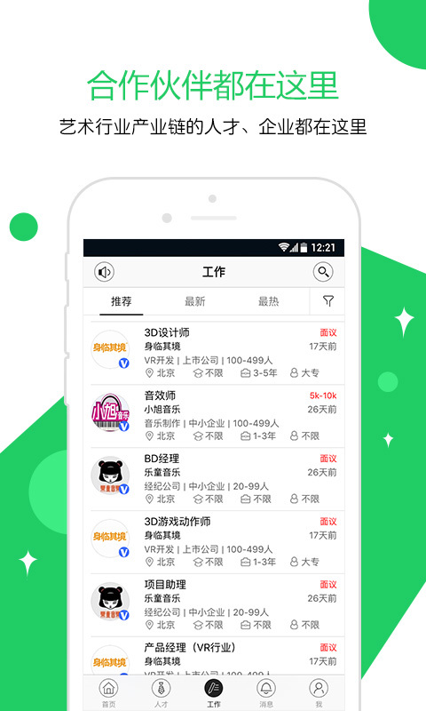 云艺术人APP是全艺术行业招聘、发通告及作品展示平台。针对全艺术公司和艺术专业人才打造的高端专业招聘平台,包含全艺术类、演艺、影视、动漫、音乐、互动游戏、广告传媒、设计、绘画艺术八大艺术专业,为艺术行业提供独立的招聘渠道和合作空间。产品运用高端互联网大数据匹配、IM即时通讯、快速生成艺术人专业简介等高端专业技术,实现三分钟找到艺术专业人才。找艺术人、找艺术企业、艺术人找工作、发通告及合作就到“云艺术人”。【软件特色】