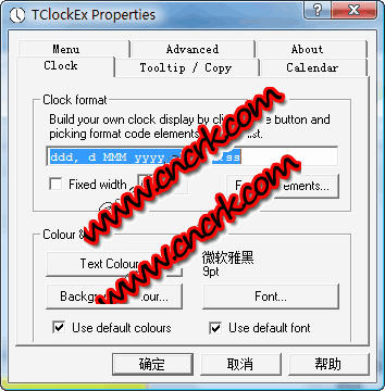 TClockEx是一个系统的桌面时钟程序。可以修改系统托盘区时钟的样式,是一个windows系统桌面时钟的增强工具。可以显示时间,日期,当前系统资源,硬盘空间等信息。