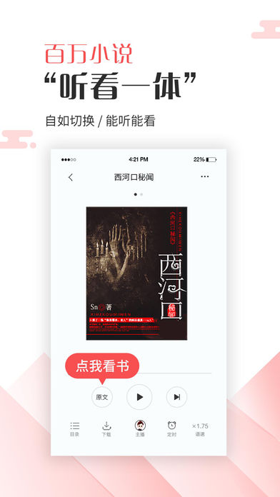 【听书模式】全网小说,一键切换听书模式,多个主播读给你听,杠杆滴音质媲美CD喔~
