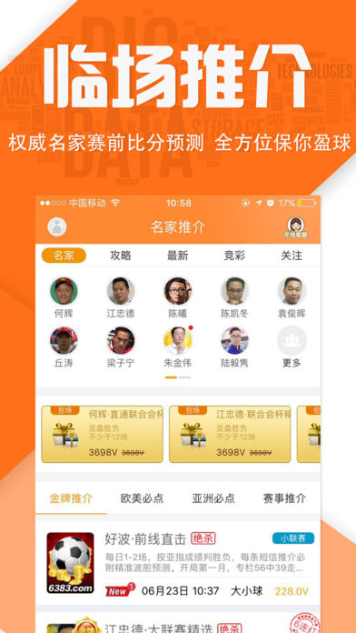 1、实名推介,精准预测至强专家阵容:何辉、江忠德、陈凯冬、陈曦、袁俊晖、杨朋锋、杜莹莹、丘涛、梁子宁、陆毅隽、朱金伟、老鬼、波仔、庄鸣、吴嘉骅、周维嘉、球王 ......