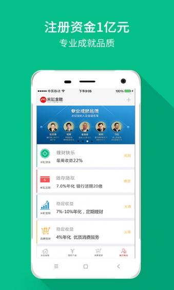 消费理财:是米缸金融首创的理财方式,是将理财与消费结合,综合收益10%~28%。投资者购买消费理财产品后,既能实现投资收益,又能获取消费折扣。比美团、大众点评、糯米、返利网之类的团购优惠幅度更大,创新的米缸金融,利用全新的消费理财项目以创新的方式进入了淘宝、京东、苏宁、易迅长期争斗的电商市场,未来以理财为先导的购物、网购模式将成为主流。