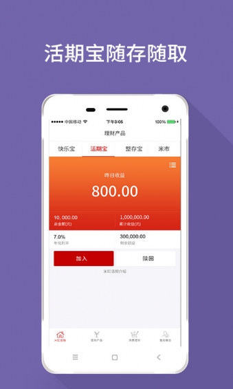 米缸活期:参考银行活期存款、活期理财的投资方式。随存随取,6.0%年化利率,超支付宝余额宝、京东金融小金库、腾讯微信理财通2倍收益。