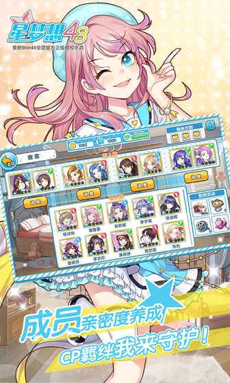 星梦想48》是首款SNH48全团官方正版授权的偶像养成类手游。成员专属剧情,偶像真人献声配音,体验最真实的互动交流;独创生活中心,少女们在外务中培养亲密度,一起成长,梦想高飞;激情打歌应援,模拟剧场公演,身临其境般的歌舞盛宴;满满歌曲收录,经典曲目随心切换,体验萦绕在耳边的熟悉旋律。《星梦想48》守护星光与梦想!【游戏特色】