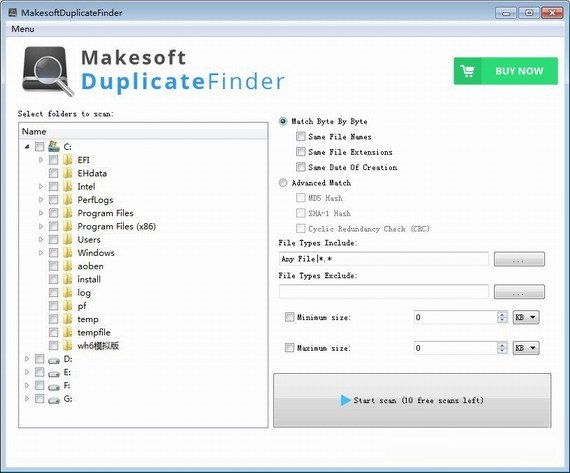 makesoft duplicatefinder是一款免费的重复文件查找工具。该工具界面清爽简约,使用简单,只需查找的条件,即可快速找出电脑设备中重复的文档、音乐、图片、视频等资源数据。