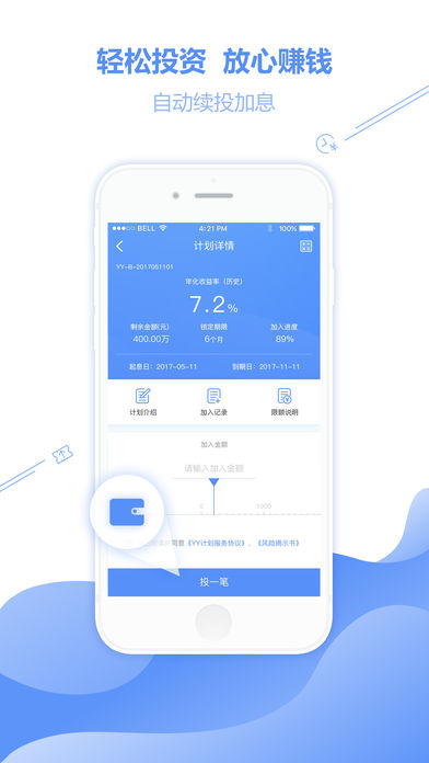 理财低门槛、高收益:1000元起投,6.2%-12%高息稳健历史年化收益;产品多元化、流动稳:产品期限和收益率完美搭配,保障投资收益增值;