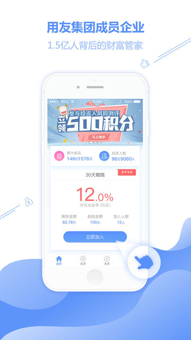 友金所理财APP,用友集团旗下移动互联网金融平台,您的投资理财神器!友金所理财APP,理财更快人一步,随时随地赚收益,躺着也能有钱花!