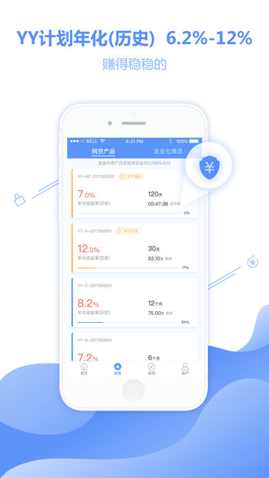 友金所作为专业的互联网金融理财平台,历史年化收益率6.2%-12%。