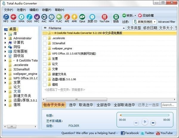 CoolUtils Total Audio Converter 5.2.150 中文多语免费版由大眼仔旭(www.dayanzai.me)发布。现在网络上的音频转换器真实种类繁多,但是好用的却寥寥无几,今天大眼仔旭(www.dayanzai.me)就给大家介绍一款功能强大的音频转换工具—CoolUtils Total Audio Converter,它可简单地将任何音频文件转换成其他的大小和格式而不需要生成临时的wav文件。而且CoolUtils Total Audio Converter可转换CD音轨,修改波特率和频率。支持各种流行的音频格式。【软件特点】