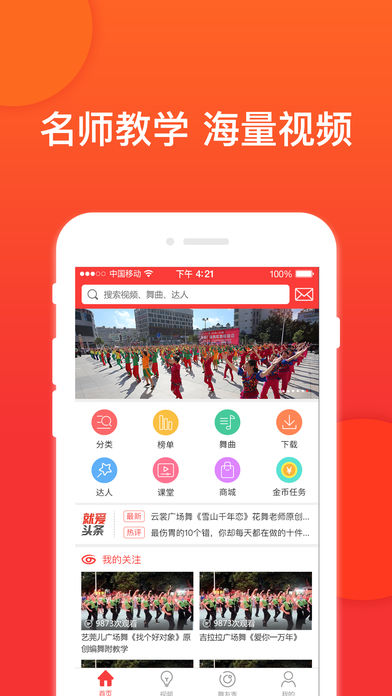 汇聚广场舞知名老师和舞队,最详细的节拍,前、后、侧三面分解动作指导及时更新最新、最热的广场舞舞曲及视频