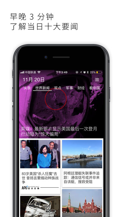 亚太日报,多元视角,掌观世界!全球化,多语种,向世界传播中国声音的新闻客户端。面向全球高端人群的多语种精选新闻。每天第一时间提供全球10大热点新闻,阅读只需3分钟,随时随地快速了解世界。界面简洁,操作方便。