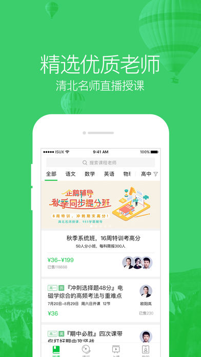 企鹅辅导是一款由腾讯推出的针对初高中生学习的辅导应用,学生可以在应用内参与名师的在线直播课程,与老师实时交流答疑,同时会有资料、习题配套内容帮助学生更好的掌握相关知识。企鹅辅导的授课老师由腾讯公司从全国挑选,均为各学科优质的老师;企鹅辅导专门为高中学子打造了完善的知识体系和最优质的在线学习体验。