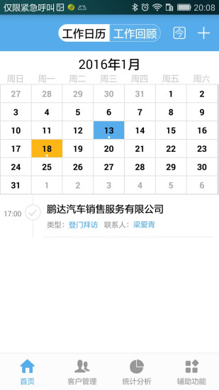 “行销”主要由工作安排、客户列表、统计分析、消息提醒和辅助功能五大模块组成。各模块详细功能如下:工作日历:按月查看每日待办和已办的拜访计划;