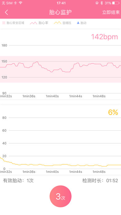 智能检测,实时监护——为胎儿提供方便准确的监护检测,使用“母婴康”APP连接胎儿监护仪,即可实时监看胎儿的各项指标数据(胎心、宫缩、胎动、胎音)。数据分析,异常预警——通过采集胎儿检测数据,利用严密的分析算法,分析评估胎儿的综合健康状况。综合评分过低时提供预警服务,及时发现胎儿异常情况。