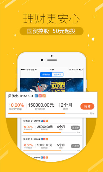 贝通网是青海省创新型互联网金融网站,由政府主导、国有资本控股,为有理财需求的出借人和具有融资需求的借款人提供资金撮合服务。作为网络借贷信息中介,贝通网致力于进一步释放金融活力,盘活民间资本,帮助实体经济解决融资难题,为投资者提供专业、高效、可靠、便捷的投资理财渠道。1. 贝优宝:贝通网推出的固定收益类产品,50元起投,年化收益率在8%~12%之间。贝优宝以担保、抵押类产品为主,同时在计息期间产品可灵活变现。
