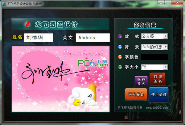 龙飞签名设计软件是一款前所未有的签名设计软件,是目前最好的签名设计软件,只要你输入你的姓名,软件立即生成你的签名
