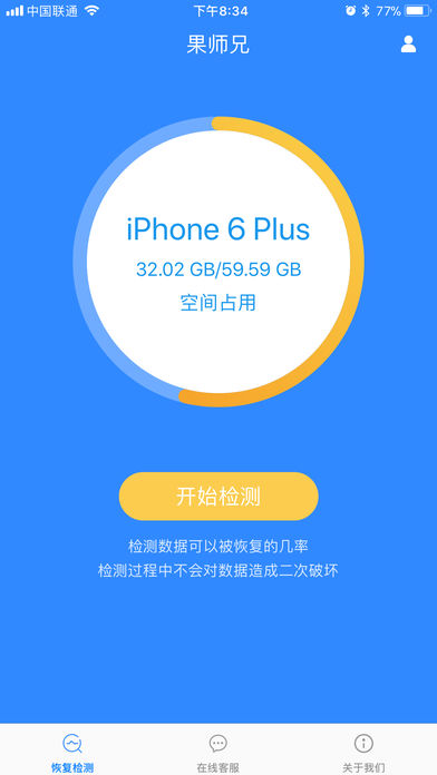 一键检测果师兄恢复大师手机版提供的一键检测功能,可以快速检测手机中已删除数据的残余情况