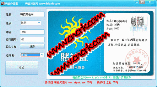 可以制作出搞笑 雷人的证件 可以制作的证件有:光棍证,聊天许可证,美女证.等等 该程序金供娱乐. 版权归 嗨皮笑话网