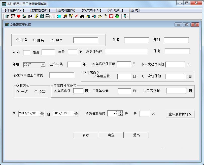 随着新劳动合同法的实施,单位员工休带薪年假已有法律依据,如何对单位员工的各种休假进行有效的管理,这是每个单位劳动人事部或人力资源部迫在眉睫的问题,本软件全程记录了单位员工的各种休假情况、方便跟踪员工在本单位内各个年度的各类休假。具有各类休假的智能系统,能够安照国家或您所在各省部委设计的休假条件自动计算出相应的休假天数,单位员工休假管理系统官方版可以方便的数据导入导出功能能够方便地与其它管理程序进行数据交换,从而高效、优质地对员工进行休假管理,是新劳动合同法的实施后不可缺少的管理工具。