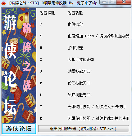 粉碎之战九项修改器是是一款用于对游戏内的各种人物属性进行修改的工具。玩家使用后,可以获得角色血值增加、血值锁定、护甲锁定等功能的强化。喜欢这款动作游戏的玩家快来把这款粉碎之战修改器下载回去吧。【使用说明】