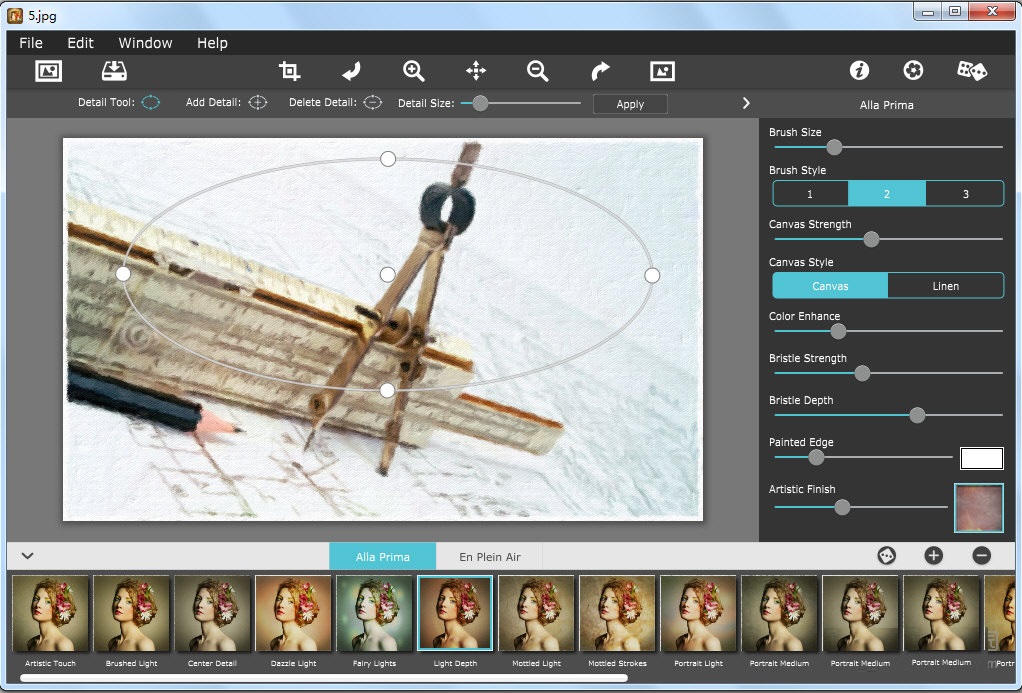Artista Impresso是一款可以将照片转变为油画效果的图片处理软件,它可以将你的各种照片或者图片处理成油画效果,软件自带Alla Prima和En Plein Air两种样式,前者可以用于肖像,后者可以用于风景,另外,还有数十种油画滤镜,可以让照片获得不一样的印象派风格。【软件功能】