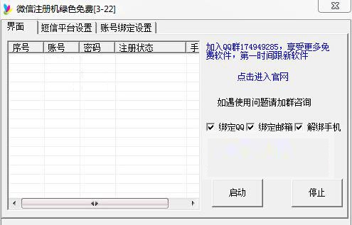 微信注册机 v1.0.0.1 绿色免费版 微信注册机是一款非常实用的微信注册账号申请工具,该软件支持新号、老号自动分类保存,支持绑定QQ、绑定邮箱、绑定手机,支持设置微信账号,用户可以使用微信注册机免费注册大量的微信账号,绝对是营销人员的必备工具。
