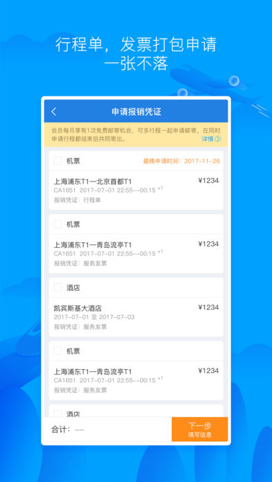 1. 购买机票、酒店、火车票(没有捆绑保险,安心购买)2. 批量申 请报销发票,更有每月免邮,邮费拜拜