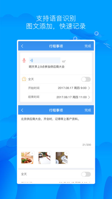 3. 语音图文事项输入,拍照记录,管 理行程超省心
