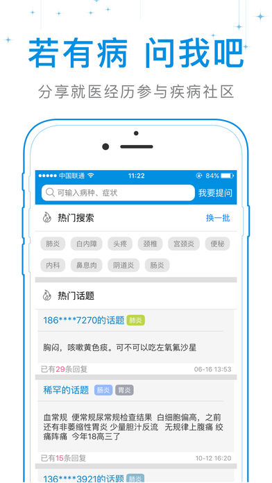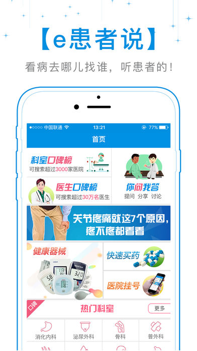 生病了、要看病、要治病就上e患者说,小到头疼、感冒、发烧,急到儿科、妇科、急诊,大到中医、西医、重症,都有治愈的患者朋友为你护航、带来健康。