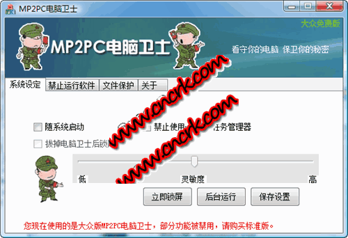 《MP2PC电脑卫士》采用软硬结合的方法为用户提供了一种操作简捷、功能稳定,安全可靠的电脑看护及电脑信息保密的软硬件一体系统。可广泛应用于企业商务信息、个人隐私的保密及家长对有网瘾、游戏瘾儿童的电脑使用的控制,同时也可用作看守个人电脑不被他人使用的目的